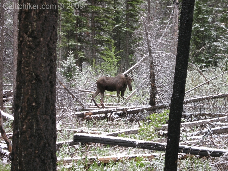 The snow was sticking to the ground and trees as we began to climb up towards Heart Lake. Despite the constant uphill grade, we covered the trail fairly rapidly and before I knew it we were at the top of the grade and started down. The snow was still falling heavily and I had collected about an inch on my hat and pack which every now and then would fall down between my back and the pack. I had decided to just stick with the t-shirt to hike in trusting that the grade would keep me warm and it worked out well. We again saw some grizzly tracks on the trail but they didn’t look recent. We didn’t see any other animals until about 500 yards from the trail head where we came to a young bull moose about 20 yards off the trail. It didn’t seem too concerned about us, so after taking some photos, we continued on to the trail head.